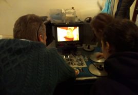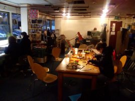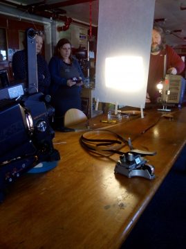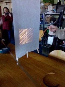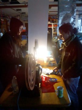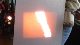 The last workshop covered projection and exhibition. We were shown how a projector works in BEEF’s typical hands on fashion, then looked at a range of models each with their own functions, strengths and weaknesses. We had a go at lacing up the projectors then explored creative ways of projecting moving image into a space using mirrors, ceilings, people and objects found within the space.