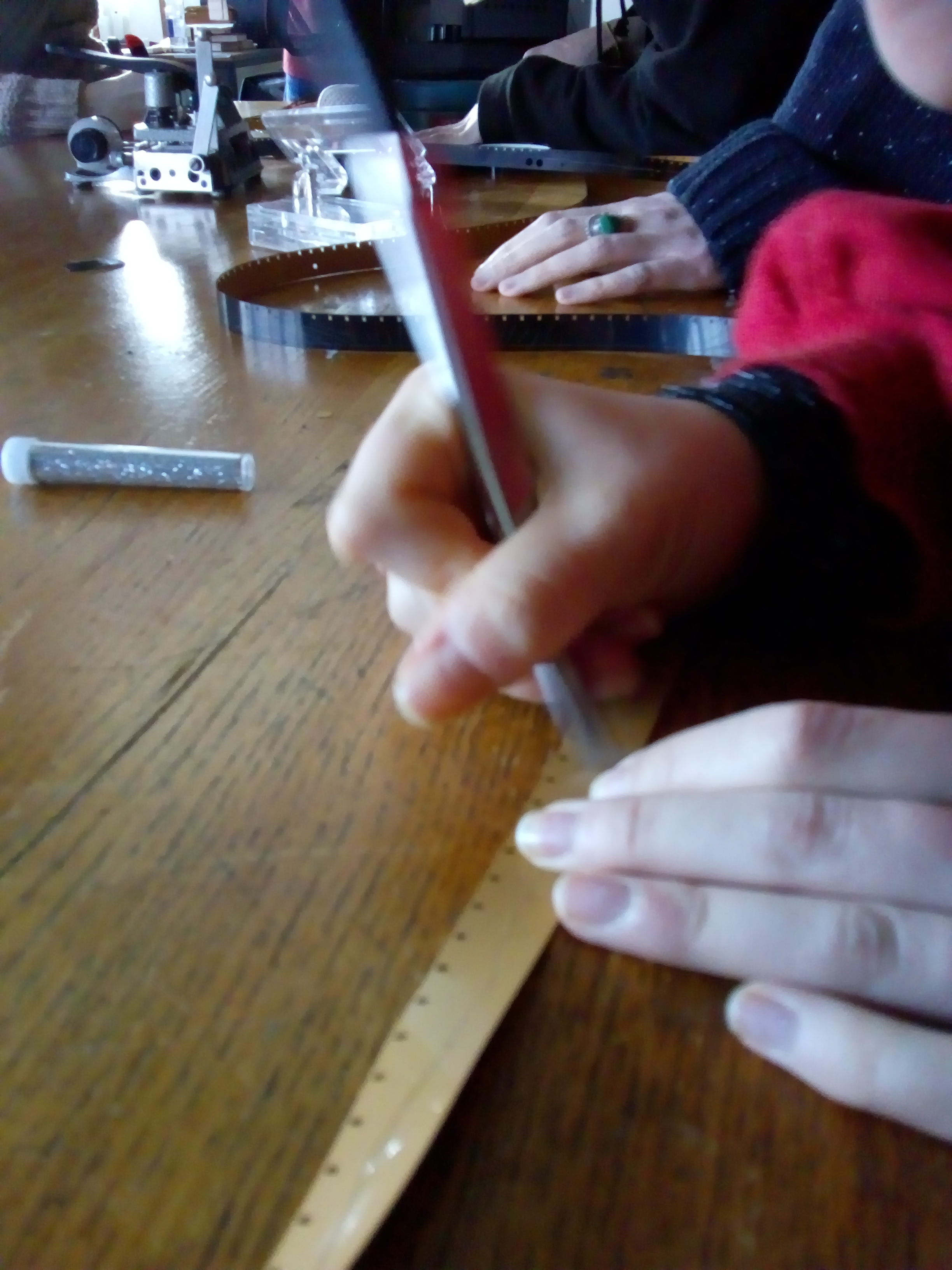 The next few workshops centred around manipulating film. We explored mark making directly onto 16mm, in this colourful workshop we used techniques such as direct drawing, scratching, puncturing, spraying and bleaching film. In the found footage workshop we used old fragments of film and spliced them together messing around with loops, repetition, pacing, mirroring, layering, cutting and joining.